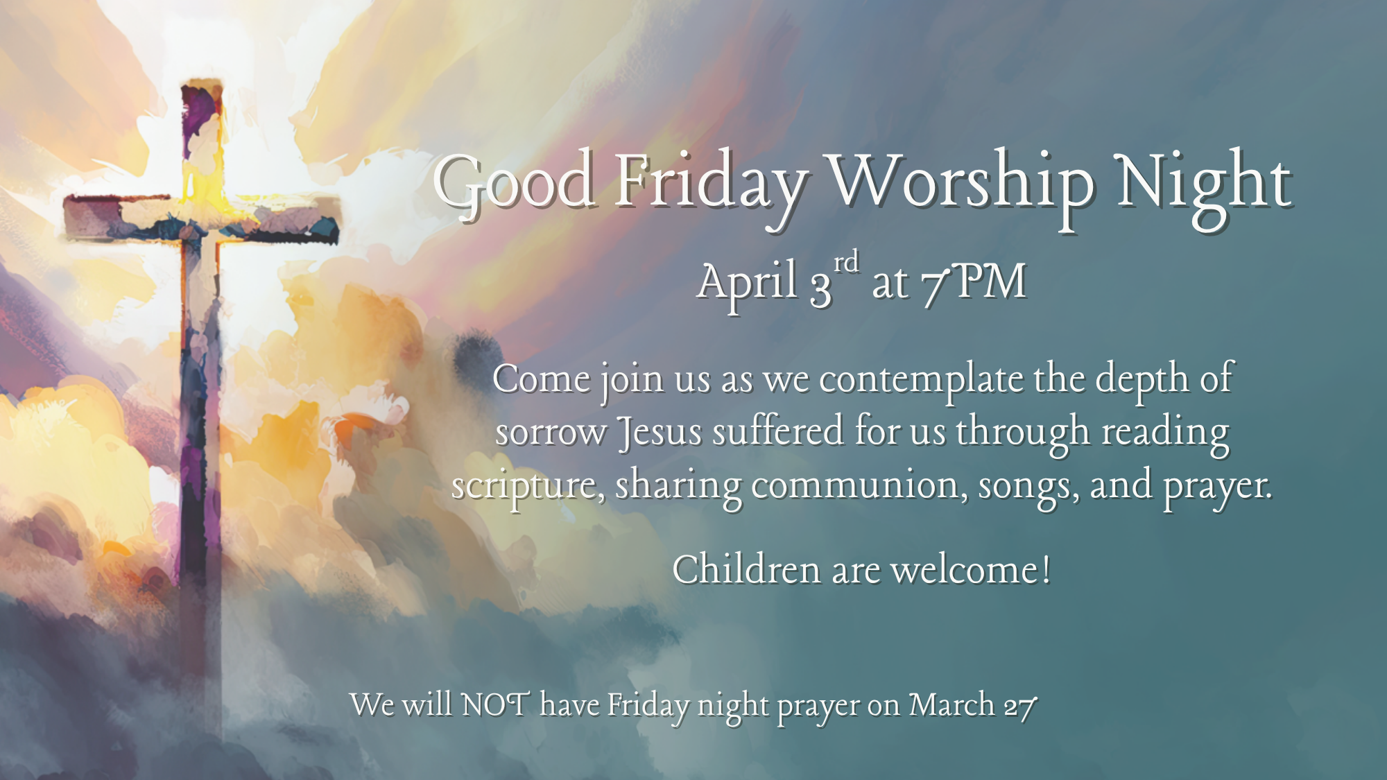 Back to All Events Good Friday Worship Night Friday, April 3, 2026 7:00 PM 8:00 PM Google Calendar ICS