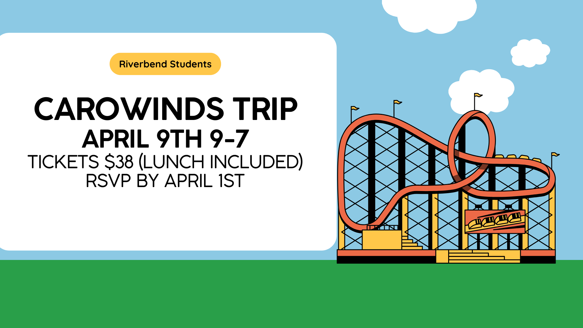 Riverbend Students will be going to Carowinds on April 9th for a fun-filled day of roller coasters and fellowship. Please register by April 1st.